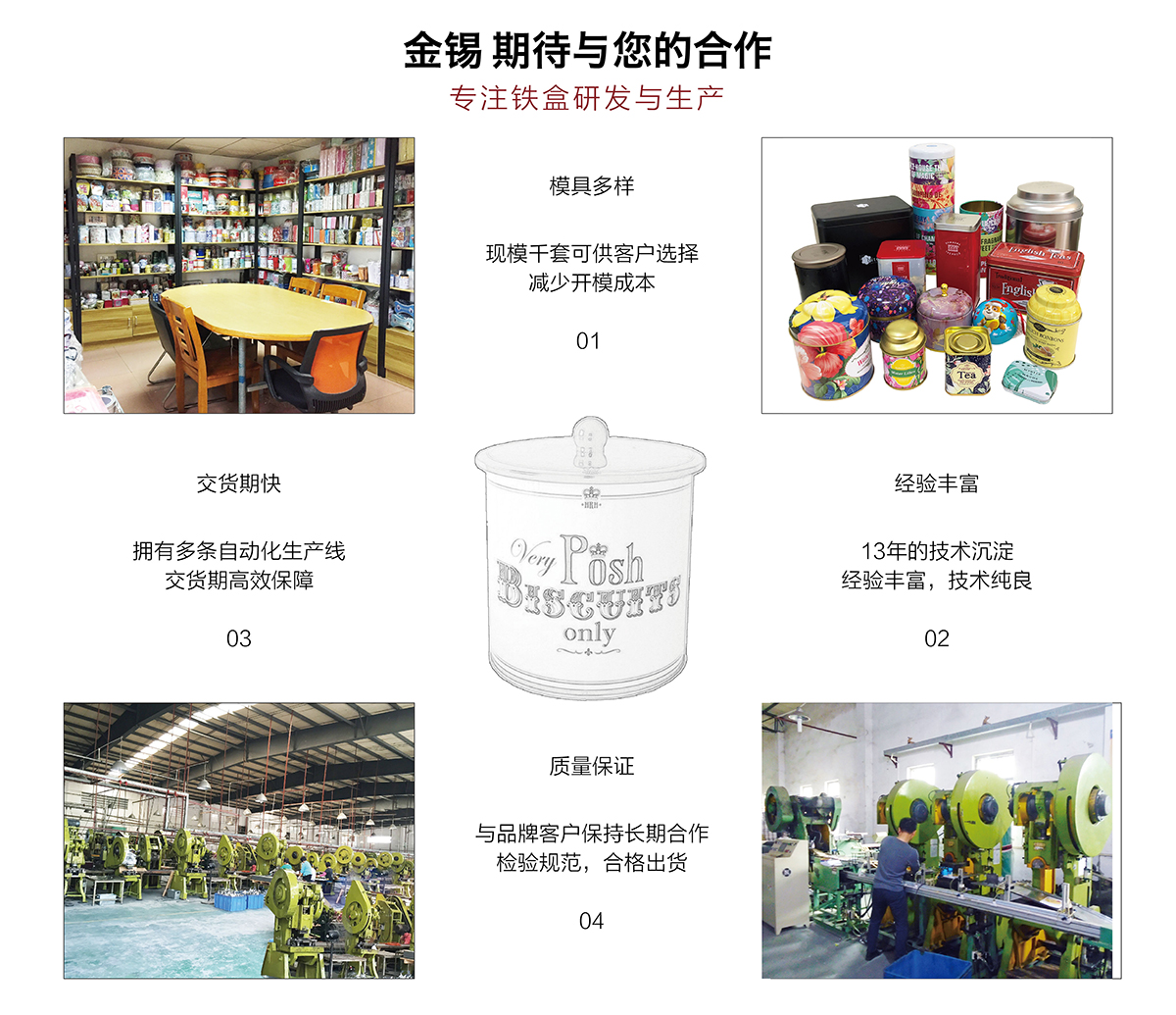 廣州市金錫五金制品有限公司成立于2016年,是已有13年生產經驗的實力廠家。我廠是專業定制優良馬口鐵盒、鐵罐、禮品盒、茶葉罐、月餅盒等金屬鐵盒包裝的制罐企業,我們擁有超過6000平方米的標準現代化廠房及八條生產線。公司集產品研發、設計、生產、銷售于一體,技術優良,實力雄厚。通過十多年的制罐經驗,我們擁有專業的技術團隊,嚴格的作業流程、完整的品質保障體系、完善的銷售以及售后服務系統。